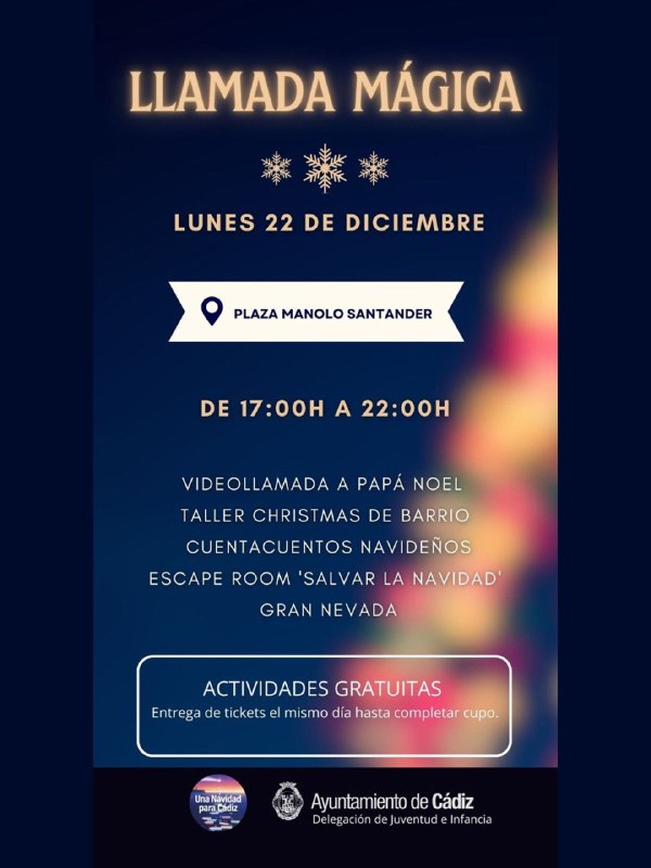 Hoy lunes 22 de diciembre✅ Una nueva 'Llamada mágica' de Una Navidad para #Cádiz 📍 En la plaza Manolo Santander⏰ Desde las 17 ho...